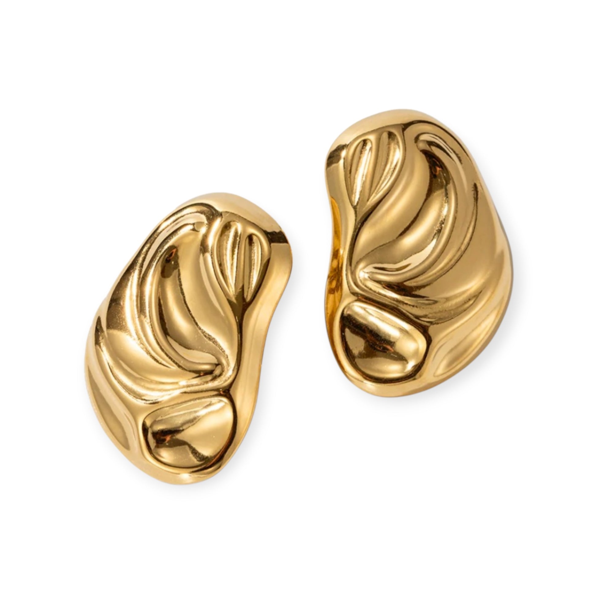 Crafted in high-shine gold-tone stainless steel, the Élan Sculptural Earrings are organic, fluid-shaped studs add an artistic twist to your everyday look. Their raised contours and polished curves reflect light beautifully, offering a modern statement that’s both powerful and refined.